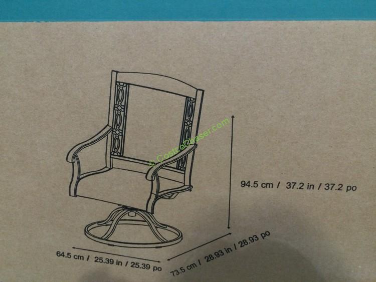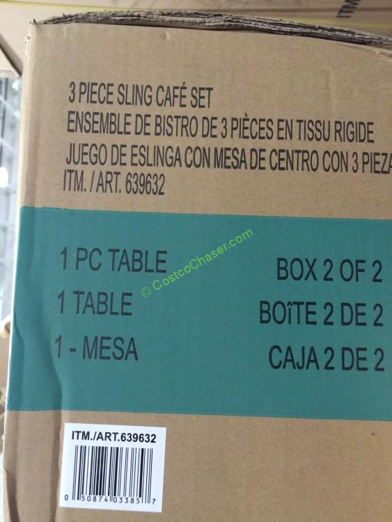 This Agio International 3 PC Bistro Set has the same style as Agio International 7 PC Sling Dining Set except smaller table and fewer chairs, it includes 1 porcelain title table and 2 swivel chairs.