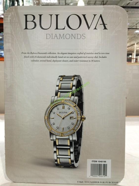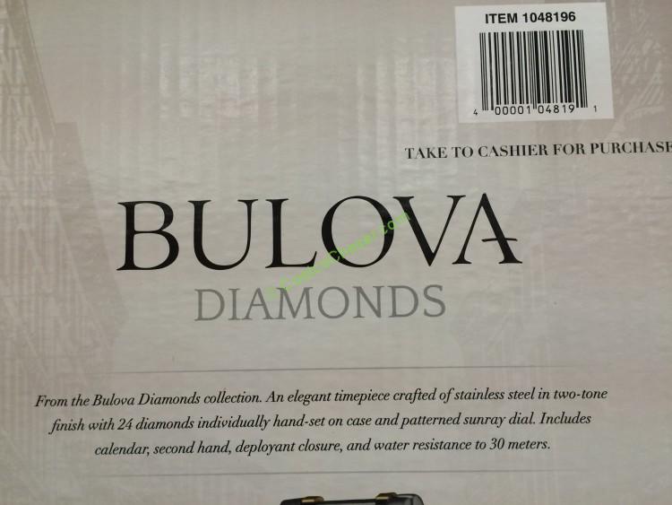 This stainless steel watch is from the Bulova diamonds collection. It is an elegant timepiece crafted of stainless steel in two tone finish with 24 diamonds individually hand-set on case and patterned sunray dial.