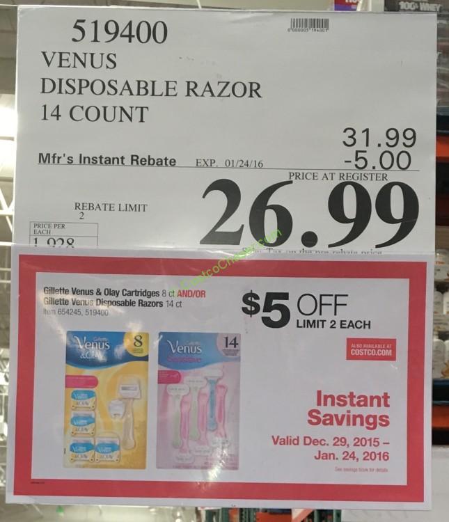 - Gillette Venus Disposable Razors, 14 ct, Costco Item #519400, $26.99 after savings