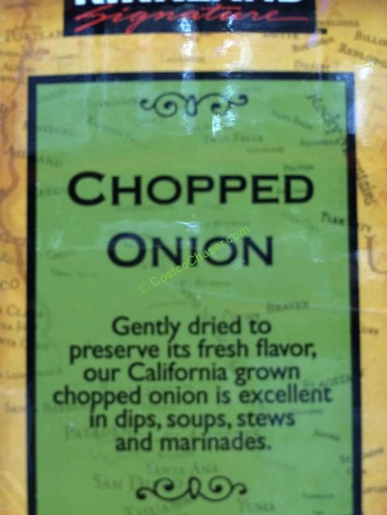 Gently dried to preserve its fresh flavor, California grown chopped onion is excellent in dips, soups, stews and marinades. Two tablespoons of this chopped dried onion is equal to 1/2 cup chopped fresh onion.