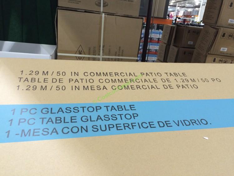 This 50-inch commercial patio table with beautiful glass top looks quite chic. It is for outdoor use only. Costco has it selling at $99.99.