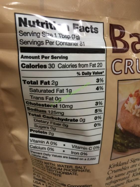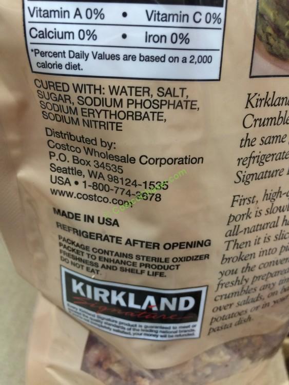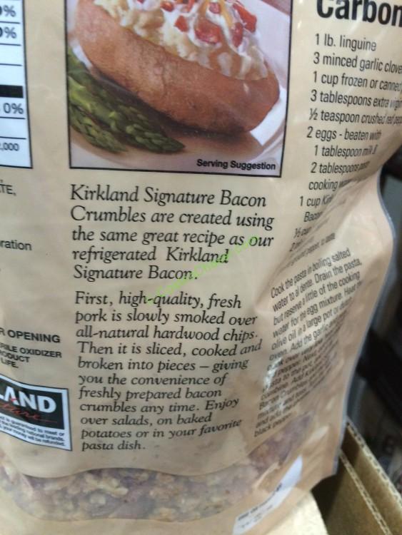 Kirkland Signature Bacon Crumbles are created using the same great recipe as Kirkland Signature Bacon you enjoy from the refrigerated section. First, high-quality, fresh pork is slowly smoked over all-natural hardwood chips. Then it is sliced, cooked and broken into pieces – giving you the convenience of freshly prepared bacon crumbles any time. Enjoy over salads, on baked potatoes or in your favorite pasta dish.