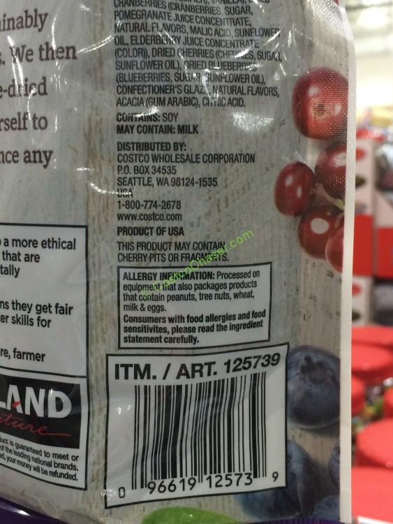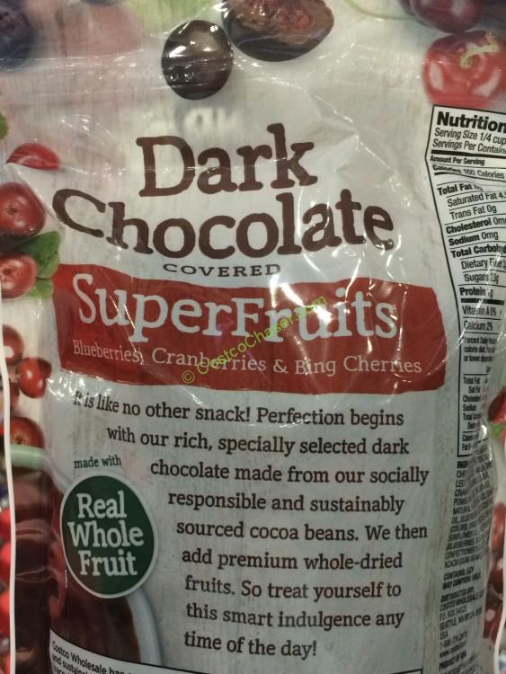 Treat yourself with this smart indulgence any time of the day! Made with real whole fruits: Blue Berries, Cranberries & Bing Cherries and covered by rich dark chocolate made from sourced cocoa beans, this Kirkland Signature Dark Chocolate Super Fruits are sure to allure your taste buds.