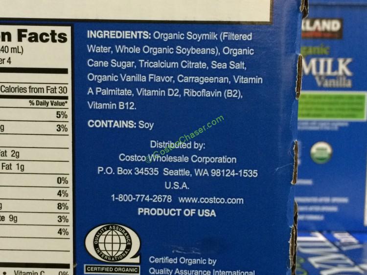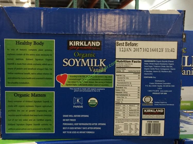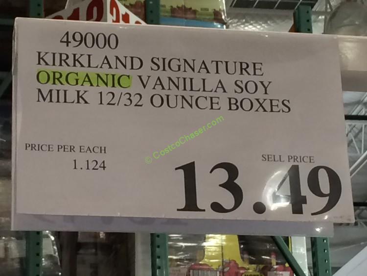 As one of Nature’s complete plant proteins, soybeans contain all the amino acids necessary for human nutrition. Costco has Kirkland Signature Organic Vanilla Soy Milk selling at $13.49. It comes in with 12 boxes of 32 ounce soy milk each. It is also available online at Costco.com for $23.49 with shipping and handling included.