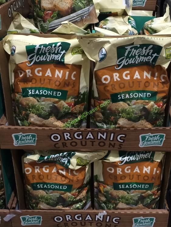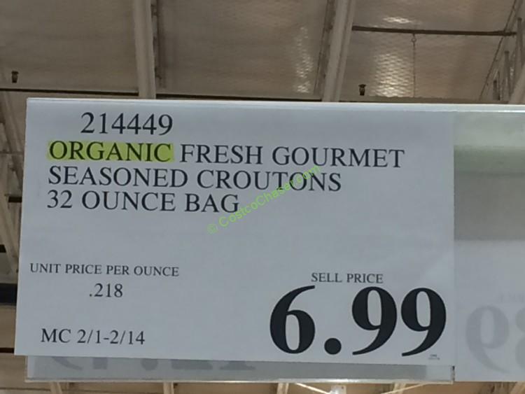 Organic Fresh Gourmet Organic Croutons offer wholesome goodness to you and your family. You can enjoy them sprinkled on your favorite organic greens or soups to taste the quality difference in every bite. Costco sells it at $6.99 for 32 ounce Croutons in a resealable Bag.