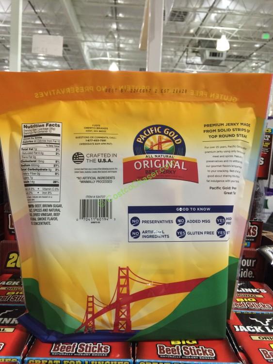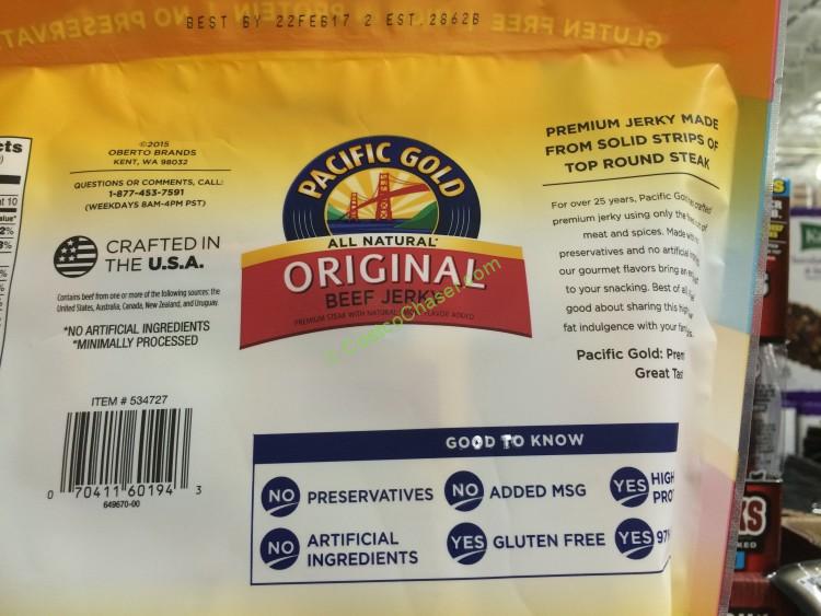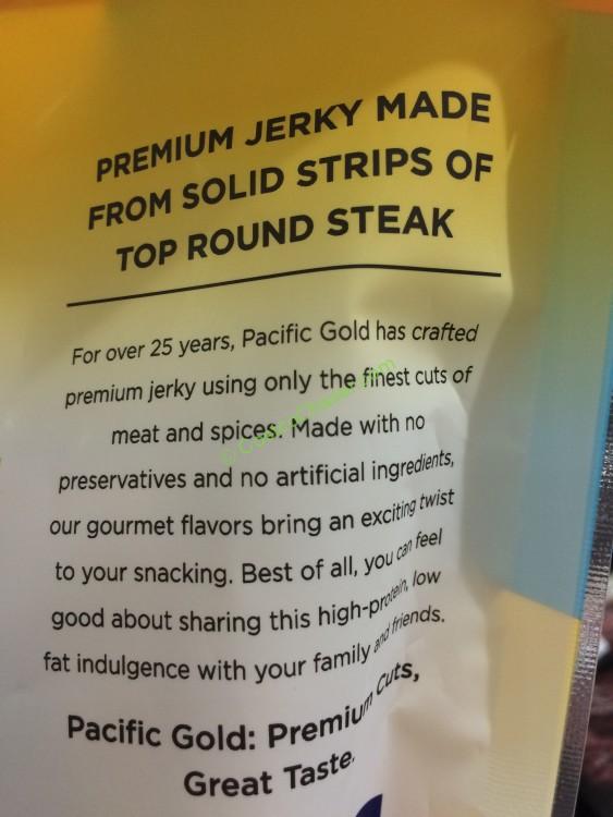 This premium Pacific Gold Original Beef Jerky is made from solid stripe of top round steak with all natural processed. It is gluten free, nothing artificial, no preservatives and no added MSG. It contains 14g protein per serving and 97% fat free.