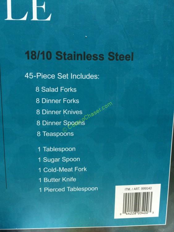 Made in 18/10 stainless steel, the additional nickel not only ensures sturdiness of the fork, but also lends the flatware to a shinier surface comparing to 18/8 (chromium/nickel) stainless steel. Priced at $49.99, Costco carries this Towle 45PC 18/10 Stainless Steel Flatware set in two collections, Simpatico or Emerson. The set serves for 8 people.